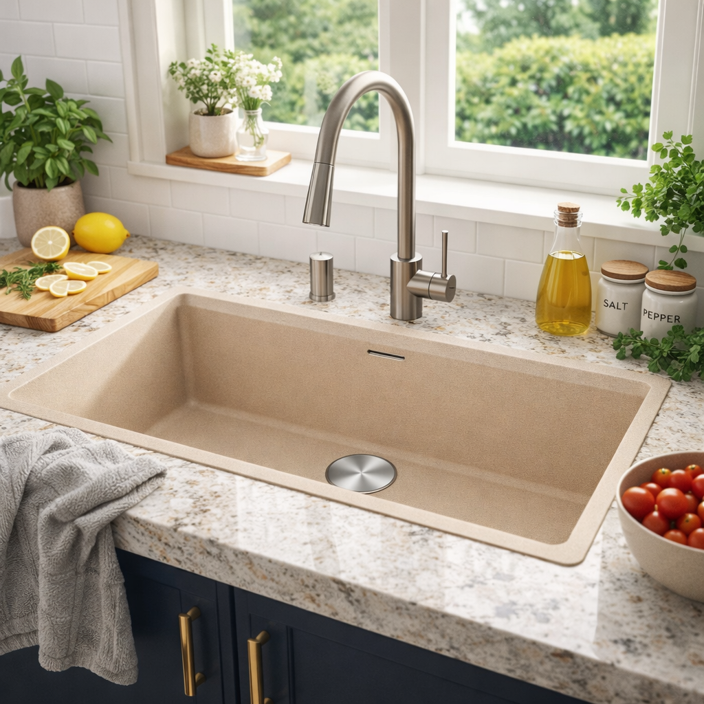 Yüksek kaliteli granit malzemeden üretilmiş olan eviye; çizilmelere, darbelere, yüksek ısıya ve ani sıcaklık değişimlerine karşı üstün dayanıklılık sunar.