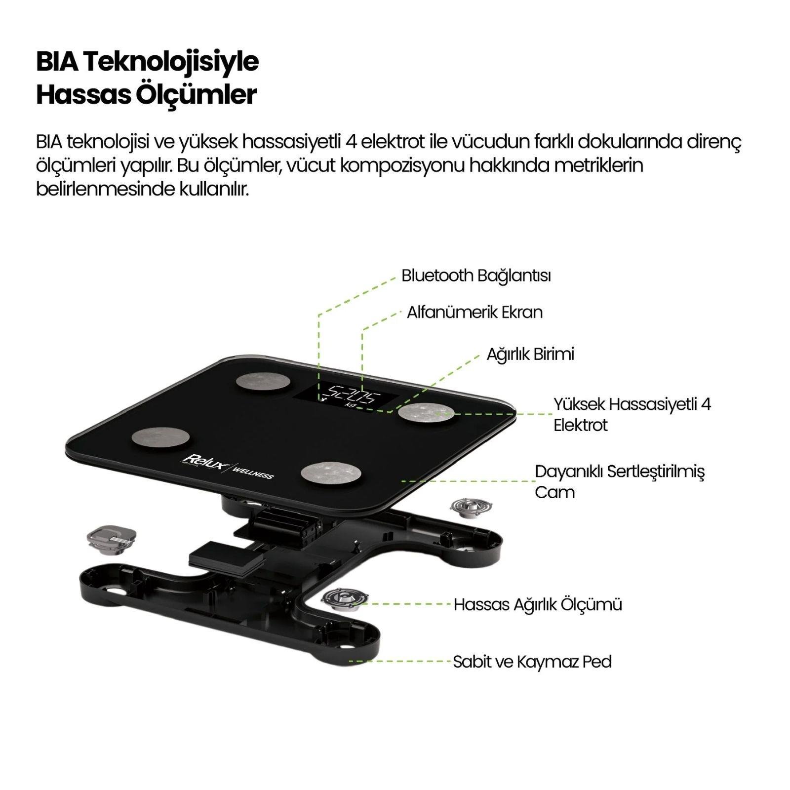 Kilonuzu değil, Vücudunuzu takip edin. Relux RBS2000 Akıllı Vücut Analiz Tartısı, sadece kilonuzu değil, vücut yağ oranı, kas kütlesi, su oranı ve daha fazlasını takip etmenizi sağlar. Gelişmiş sensörlü BIA teknolojisi ve kullanıcı dostu FeelFit mobil uygulaması ile sağlık verilerinizi detaylı şekilde analiz edin ve kişiselleştirilmiş bir deneyim elde edin. Relux RBS2000, 3 adet AAA ince pil ile çalışır. Vücut kompozisyonuna ait metriklere ulaşabilmek için, tartının bluetooth aracılığıyla telefon uygulaması ile eşleştirilmesi gerekmektedir. Kapsamlı sağlık takibi yapabilmek için RBS2000’in Android ve IOS destekli uygulaması ile eşleştirilmesi gerekiyor. Uygulamayı indirdikten sonra kaydolun. Cihazlarım kısmından cihaz ekle seçeneğine tıklayın ve RBS2000’in üstüne 1 kere çıkıp inin. Ardından Mobil uygulamada RBS2000’i görüntüleyeceksiniz, ekleyin ve daha sonra ölçümünüzü yapmak için tartıya çıkın. Ölçümün tamamlanmasını bekleyin ve sonuçlarınızı uygulama üstünden görüntüleyin.