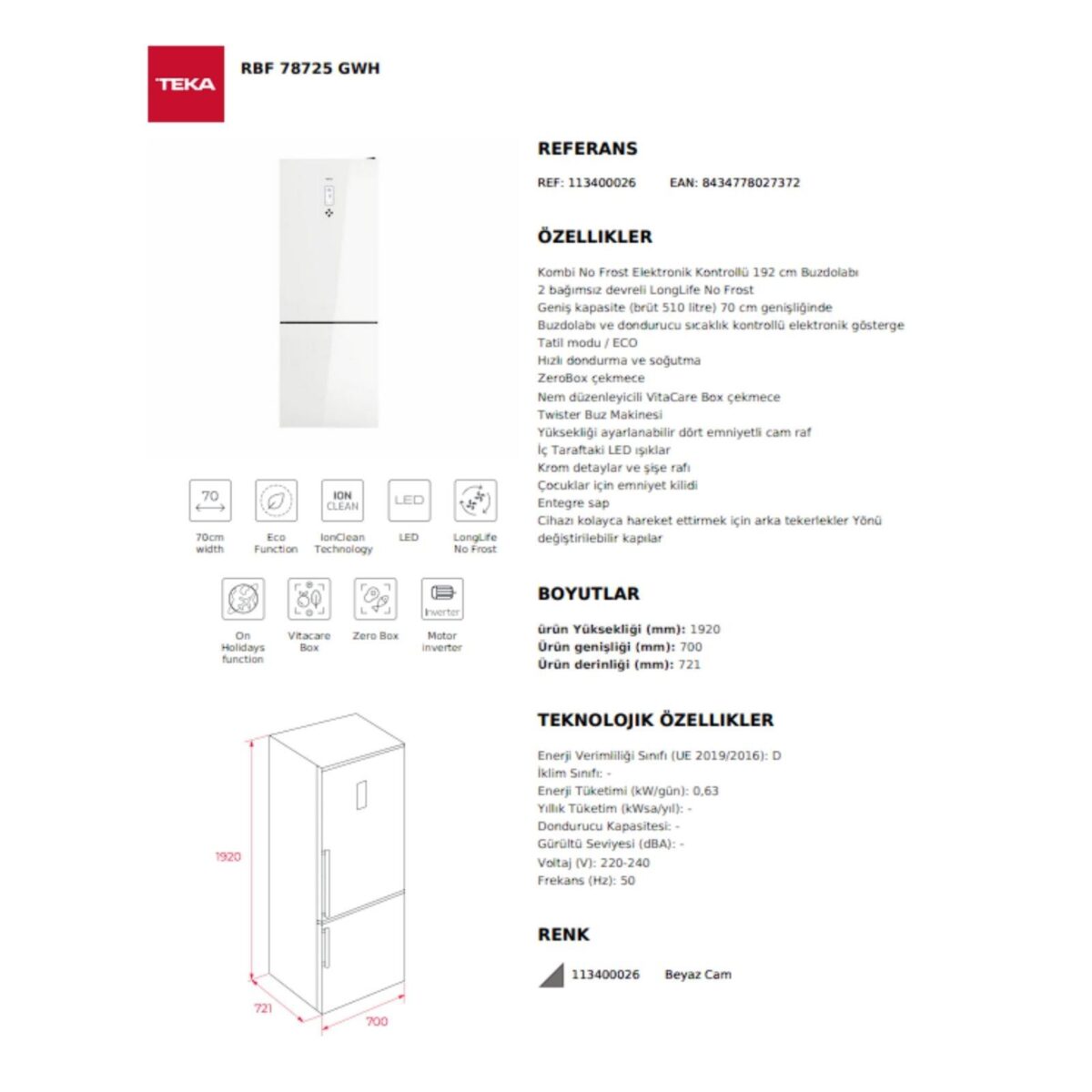 Teka RBF 78725 GWH EU No Frost Beyaz Solo Buzdolabı